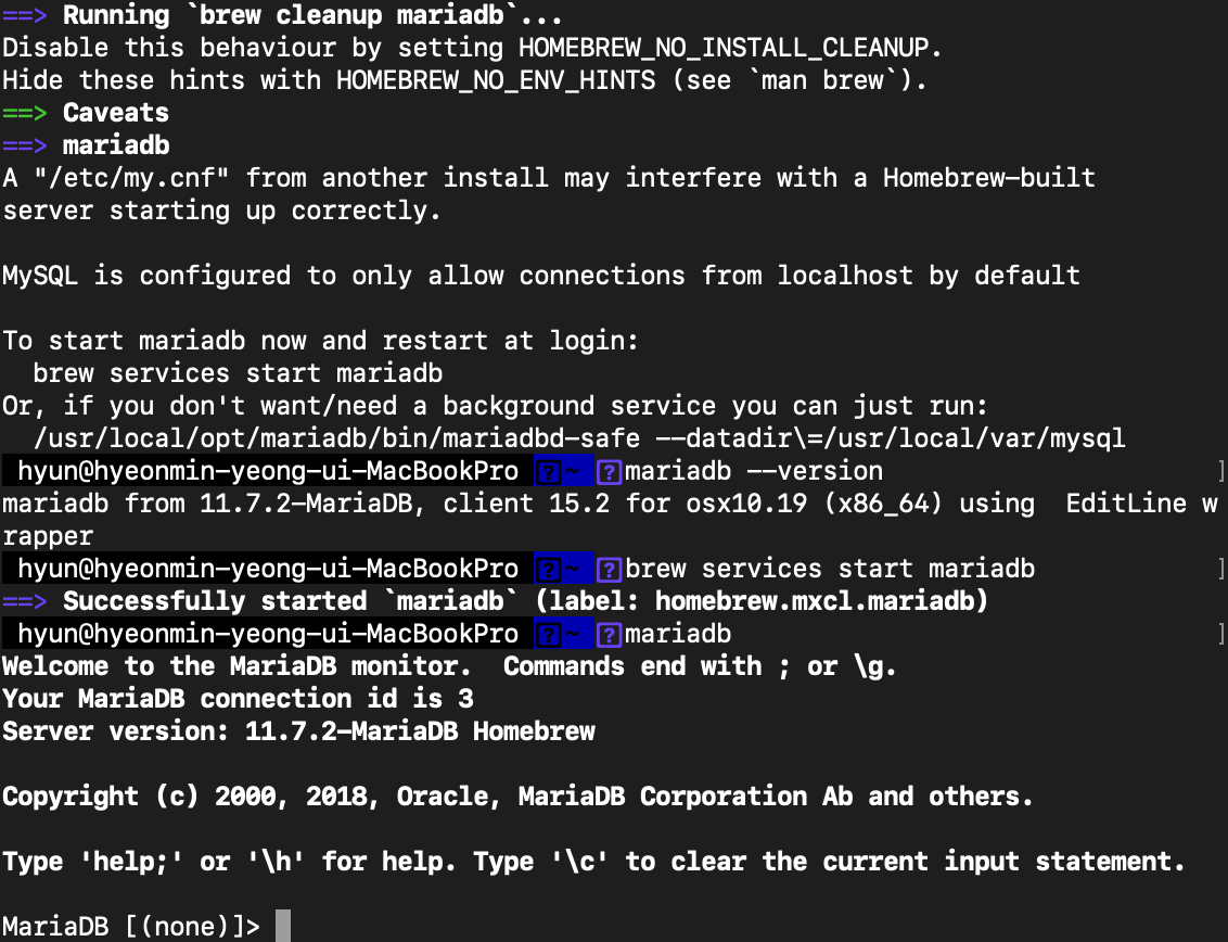 homebrew로 mariaDB를 설치해도 초기비밀번호가 남아있거나, 재설치를 해도 초기화가 안되고 설정 충돌이 나는 듯 했다.