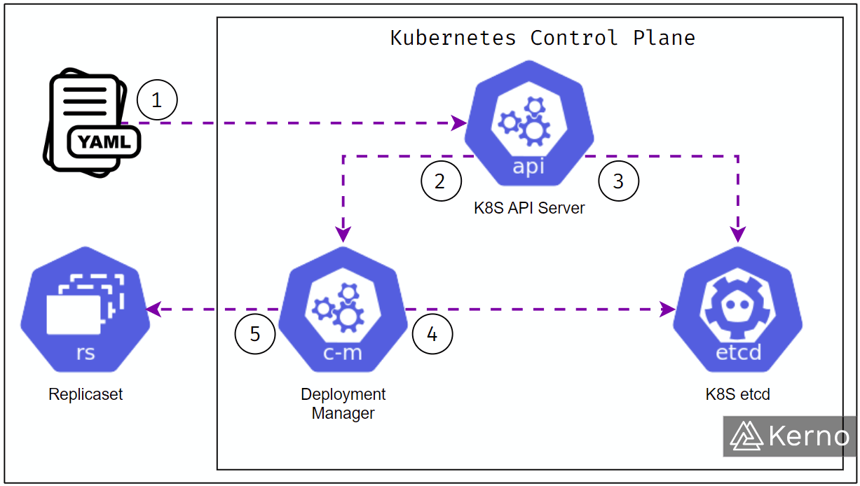 예를 들어, nginx 파드를 3개 띄우고 싶다면 replicas: 3으로 선언한다. - API Server에 전달되고 etcd에 저장됨