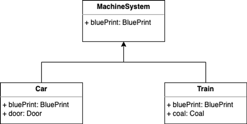 - 자동차와 기차 객체는 하나의 공통된 기계시스템 객체를 토대로 만들어진다고 가정