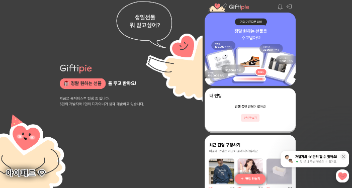 유저테스트도 진행했는데, 팀원들끼리 내부적으로 테스트할 땐 찾을 수 없던 오류들에 대해서도 피드백을 많이 받았다. 확실히 여러 의견들을 받아볼 수 있어 큰 도움이 되었다. 피드백 받은 내용 바탕으로 보완도 하다보니 좀 더 개발 시간 갖고 완성하면 실제로 Giftipie를 런칭할 수도 있지 않을까 생각도 들더라.