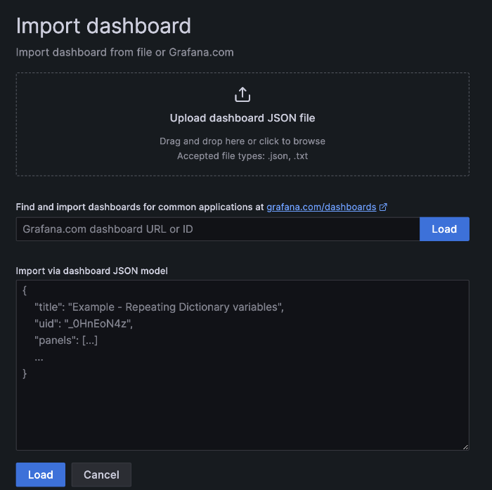 이런 화면이 나오는데 Upload dashboard JSON file 에 다운로드 받은 JSON 파일을 끌어다 놓고, 밑의 Load를 누르면 대시보드가 생성된다.