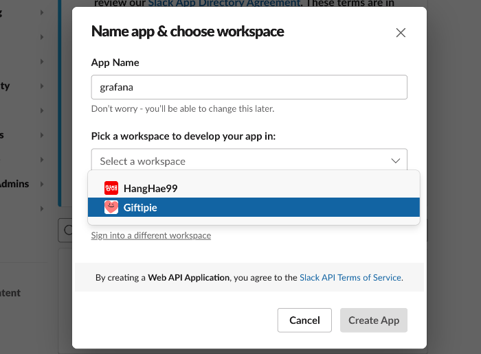 App Name을 입력하고, 연동할 Slack Workspace를 선택하고 Create App을 눌러 생성합니다.