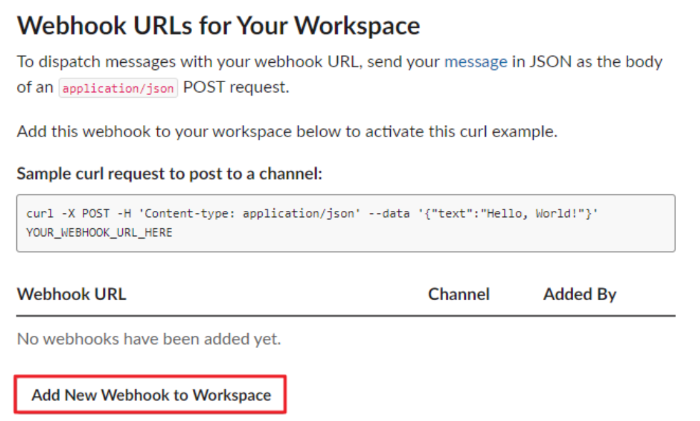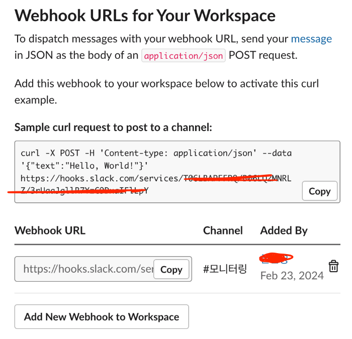 활성화 후, 목록이 보여지는데 Add New Webhook to Workspace 를 눌러 Webhooks URL을 생성합니다.