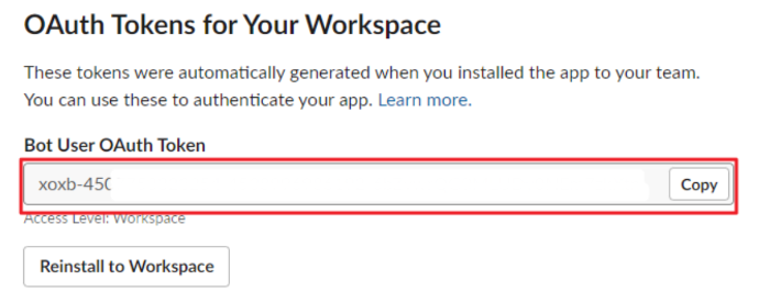 OAuth Tokens for Your Workspace 목록에서 Install to Workspace 버튼을 클릭하여 Bot User OAuth Token을 생성해줍니다.