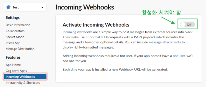 Incoming Webhooks 메뉴에서 off를 on으로 활성화시켜줍니다.