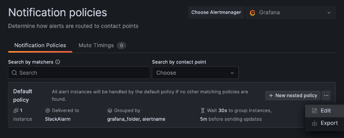 이제 생성된 Contact Points를 실제 Notification policies에 등록 해주어야 한다.