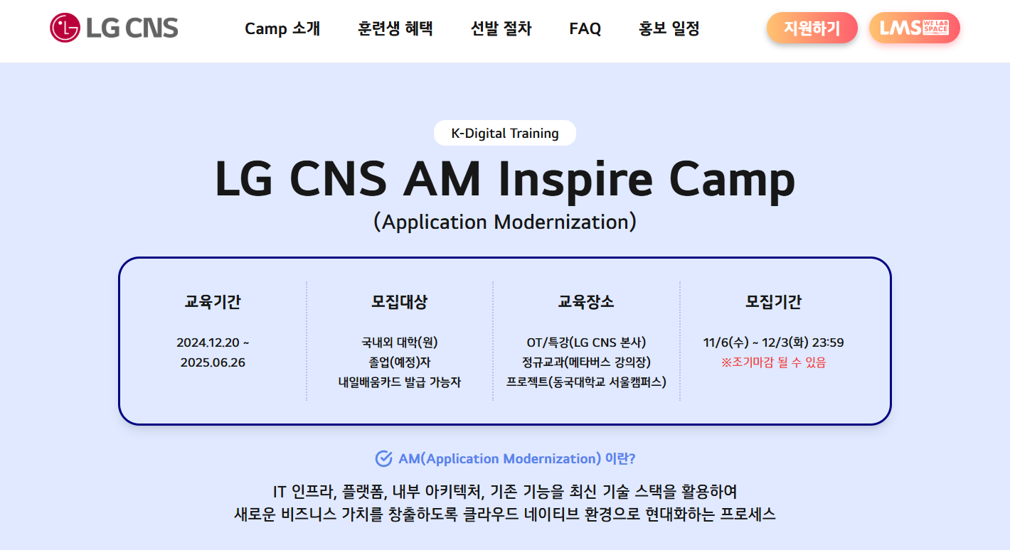 그러다 우연히 LG CNS AM Inspire Camp라는 프로그램을 알게 됐다. 대기업이 자체적으로 운영하는 Dev Camp라는 말에 귀가 솔깃해져 바로 지원했다.