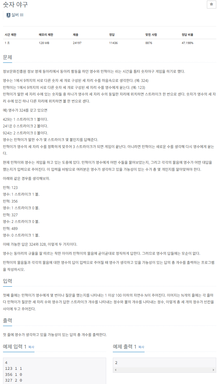 그런데 숫자야구는 서로 자리수가 중복되지 않기 때문에