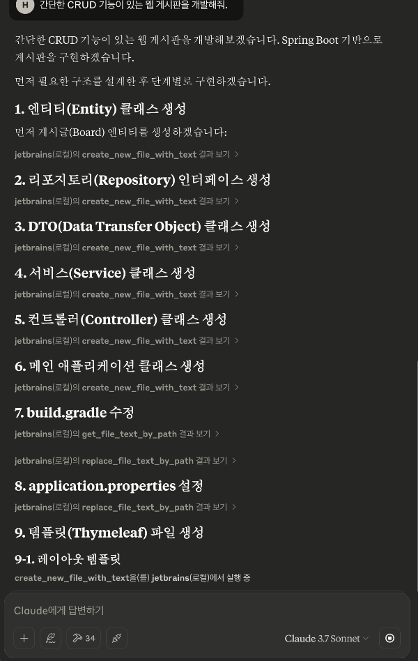 정말 짧은 명령어 한줄, "간단한 CRUD 기능이 있는 웹 게시판을 만들어줘" 로 1~2분 남짓 시간안에 Spring 입문 퀄리티 수준의 웹 게시판을 개발해줬다. 애초에 요구한 결과물이 딱 그 정도였지만, 속도면에서 정말 충격적이었다.