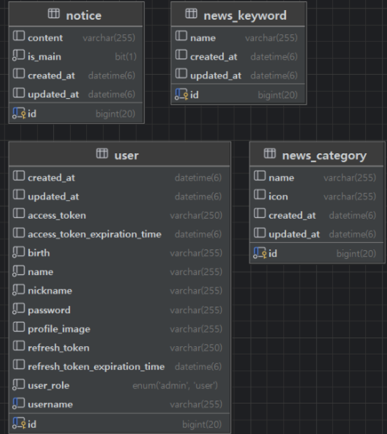 팀원 구성 및 역할 분담은 프론트엔드 2명, 백엔드 2명, 인프라 1명이었다. 나는 여기서 팀장과 백엔드를 맡았고, Spring AI를 활용한 뉴스 서비스, 전역 예외처리, 회원 서비스, 카테고리 서비스, 키워드 서비스, 공지 서비스를 개발했고 Spring Cloud Gateway 적용을 했다.
