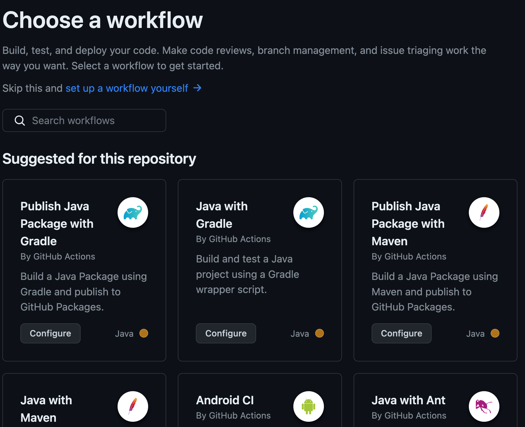 GitHub를 사용하다보면 Repository에 Actions라는 탭을 본적이 있을것이다. 바로 요녀석이었다. 이녀석을 사용하기 위해서는 먼저 배포할 프로젝트에 디렉토리를 만들고 yml파일을 세팅해줘야한다. actions 탭에 들어가서 아래와 같이 Configure 버튼을 눌러서 편하게 바로 만들 수도 있다.