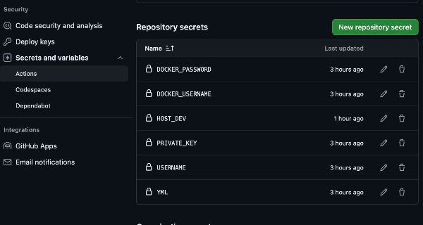 이렇게 Secrets을 설정할 수 있는데, 위 사진에는 이미 등록이 되어있어 저렇게 나오지만 아무것도 등록이 되어있지 않은 상태라면 New repository secret을 눌러 Secret을 등록해주면 된다.